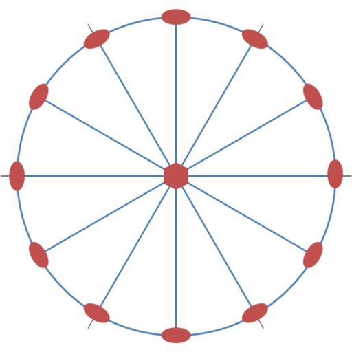 | Keywords: 6mmm point group.png en Stereographic representation of the symmetry point group 6/mmm The 001 direction is perpendicular to the projection plane The mirror planes are represented in blue the rotation axes in red The thin black ticks show the direction of the equivalent crystallographic axes a1 a2 and a3 fr Représentation stéréographique du groupe ponctuel de symétrie 6/mmm La direction 001 est perpendiculaire au plan de projection Les plans miroirs sont représentés en bleu les axes de rotation en rouge Les trait fins noirs montrent la direction des axes cristallographiques équivalents a1 a2 et a3 own Perditax 2011-06-06 Cc-zero Point groups |