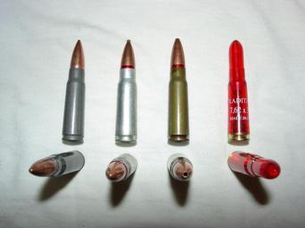 Keywords: 7.62 Russian Cartridge.jpg en From left to right Wolf FMJ Silver Bear match ammo with zinc-plated case Wolf JHP and 7 62x39mm snap cap 2006-08-08 own W3bj3d1 cc-zero Uploaded with UploadWizard 7 62x39 Snap caps