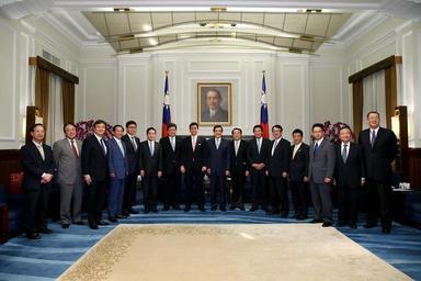 亞協李會長(右7)陪同馬總統(右8)接見日本自民黨「促進日本・臺灣經濟文化交流青年議員之會」(「日臺青年議聯」)會長岸信夫(右4)眾議員,會後與會人全體合影留念(總統府提供).jpg (2970x1980)