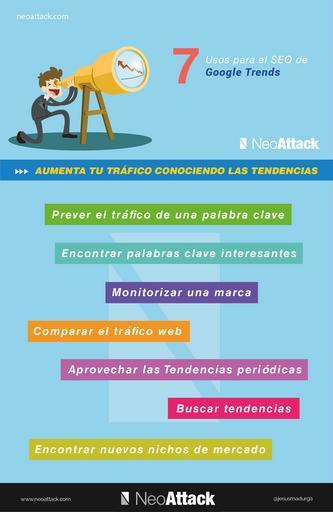 | Keywords: google trends tendencias contenidos tematicas sem buscadores marketing online digital herramientas gratis outdoor Google Trends en Español Para ver el artículo entero neoattack.com/google-trends-en-espanol-guia-con-funciones... Guía con Funciones, usos SEO + Video tutorial Google Trends en Español es la herramienta de Google que te ayudará a conocer las tendencias de búsqueda en todo el mundo. Esta herramienta, tanto para los profesionales del SEO como para cualquier profesional del marketing online es indispensable para estar al día y un perfecto complemento para diseñar tu estrategia online. Por ejemplo: Con Google trends un Social Media Manager podrá saber qué temas son los más hablados para postear sobre ello y conseguir un mayor engagement. Con Google Trends un SEO sabrá la tendencia de las palabras clave que ha planificado en su estrategia y podrá tomar decisiones en consecuencia. Con Google Trends un blogger o una empresa podrán ser los primeros en posicionarse por una palabra clave con tendencia alcista y aprovechar las olas de crecimiento de estas para dirigir tráfico web sin mucho esfuerzo. Con Google Trends tu empresa sabrá si en una determinada zona geográfica están interesados por una palabra clave en concreto para determinar si invertir en expandirse a dicha zona o no. Con Google Trends una marca puede ver su propia tendencia y rectificar su estrategia en caso de descenso de la tendencia o ayudarse de los picos para crecer aún más. etc. Pero antes de empezar con los usos para SEO veremos el dashboard con las funciones básicas de Google Trends. Funciones básicas de Google Trends Para ver las funciones básicas vamos a ver parte por parte lo que nos ofrece esta herramienta. Comparar términos Comparar 2 o más términos Compara 2 o más términos individualmente o en grupos utilizando “+”. Se pueden comprar hasta 5 términos individuales o grupos de un máximo de 25 términos en cada grupo. Google Trends nos permite también comprar los términos por ubicaciones. Para ello simplemente tenemos que hacer clic en “Ubicaciones”. Tan y como aparece en la imagen de abajo. Al igual que los términos, podemos añadir también hasta un máximo de 5 ubicaciones, incluidos países y ciudades. Es importante recordar que si no es una búsqueda de una palabra que se utilice en todos los países que añadamos, como en este caso SEO, que vale tanto para inglés como para Español, deberemos hacer las comparaciones de manera independiente. comparar terminos ubicaciones Cómo comparar períodos de tiempo Con Trends también podemos hacer comparaciones de términos en diferentes periodos de tiempo. Para comprar estos términos por intervalos solo tenemos que hacer clic en “intervalos de tiempo”. Al igual que los términos y las ubicaciones, en los intervalos también podemos incluir únicamente 5 periodos de tiempo distintos y modificar la situación geográfica de la búsqueda. comparar termino tiempo Cómo filtrar las búsquedas filtrado busquedas trends Otra de las funciones básicas que nos ofrece Google Trends es la del filtrado de las búsquedas. En este apartado podemos encontrar: Localización geográfica: Las búsquedas que realicemos podemos filtrarlas por países o, en caso de España, comunidades autónomas. Si necesitas conocer tendencias en las búsquedas locales este apartado te resultará de mucha ayuda. Fechas: Filtrado de búsquedas de tendencias por fechas predefinidas o tus propias fechas personalizadas. Categorías: Filtrado por la categoría a la que pertenezca el término de la búsqueda. Lugar de búsqueda: Este filtro te permitirá elegir si quieres buscar en la web, entre las imágenes, noticias, Google Shopping o en Youtube. Cómo exportar datos de búsqueda exportar csv trends La herramienta nos permite que podamos exportar los datos de las búsquedas que hayamos obtenido a un fichero .csv, para que luego lo podamos abrir fácilmente con la aplicación Excell. ¿Cómo lo hacemos? Hacemos clic en los 3 puntos y desplegamos el menú que aparece en la anterior imagen, luego hacemos clic en “Descargar como archivo CSV”, y acto seguido se descargará el archivo en nuestro ordenador. Tendencias en Búsquedas tendencias busquedas google En el menú de Google Trends en Español podemos encontrar, justo después de Explorar, las tendencias en búsquedas. En este apartado encontraremos las tendencias de búsqueda más importantes del año presentadas por días y segmentadas por el país que hayas elegido en caso de que lo hayas hecho. Tendencias en Youtube tendencias busquedas youtube Igual que las tendencias en Búsquedas pero esta vez del buscador de Youtube. Muy útil para ver los vídeos más virales por país y por día. Más populares Una forma de encontrar las búsquedas más populares divididas por categorías y país durante todo el año anterior. El único inconveniente de este apartado es que solo presentan los resultados a año cerrado, pero aún así nos puede ser de utilidad (sobre todo a principio de año) para analizar el año anterior y poder utilizarlo en nuestra estrategia de contenidos. Las categorías de tendencias que ofrecen son: Palabras de mayor crecimiento en el año anterior Futbolistas más buscados Tendencias en Celebrities Destinos más buscados Tendencias en Dietas Tendencias ¿Cómo…? Tendencias ¿Qué es…? busquedas populares googleImagen: Búsquedas más populares en Google Si te parece interesante Google Trends te recomiendo que también te leas nuestro post “Google My Business, SEO para Negocio Local” 7 Usos de Google Trends para el SEO El uso más importante de Google Trends es ayudarnos a conocer cómo evoluciona una keyword a lo largo del tiempo. Sabiendo esto podrás: Prever el tráfico de una palabra clave La más básica de las funciones pero no la menos importante, es usar Google Trends para prever el tráfico de una palabra clave determinada. Si sabemos la tendencia de tráfic