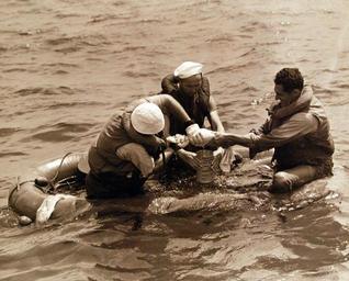 | Keywords: outdoor monochrome 80-CF-827-3-13: Life-Saving Equipment. Emergency Fishing Kit, April 19, 1943. No longer do castaways on a life raft need to fear starvation and thirst. A simple, compact, complete, and fool-proof Emergency Fishing Kit is now standard equipment on all lifeboats, rafts, and planes of Navy, Army, and Merchant Marine. Hooks, lines, lures, spear, bait, and a net provide the means to catch food. In addition, the flesh of fish can be squeezed to provide drinking fluid. The kit was originated by Gifford Pinchot and developed by Michael Lerner, S. Kip Farrington, and Philip Wylie. Shown: The cloth with cut up fish filets is twisted tightly, forcing out natural juices into the can. The juice will serve as water to the castaways. U.S. Navy Photograph, now in the collections of the National Archives. (2016/05/03). 80-CF-827-3-13: Life-Saving Equipment. Emergency Fishing Kit, April 19, 1943. No longer do castaways on a life raft need to fear starvation and thirst. A simple, compact, complete, and fool-proof Emergency Fishing Kit is now standard equipment on all lifeboats, rafts, and planes of Navy, Army, and Merchant Marine. Hooks, lines, lures, spear, bait, and a net provide the means to catch food. In addition, the flesh of fish can be squeezed to provide drinking fluid. The kit was originated by Gifford Pinchot and developed by Michael Lerner, S. Kip Farrington, and Philip Wylie. Shown: The cloth with cut up fish filets is twisted tightly, forcing out natural juices into the can. The juice will serve as water to the castaways. U.S. Navy Photograph, now in the collections of the National Archives. (2016/05/03). |