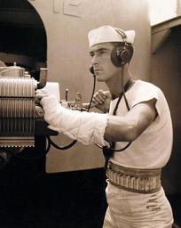 | Keywords: monochrome 80-G-10695: USS Memphis (CL 13), Fire-Control Gun-Captain, Boatswain’s Mate Second Class is preparing to fire a charge. The belt he wears hold primers used in the discharging of a powder charge. Around his arm, he wears a towel that is saturated with water during an action, 1942. U.S. Navy Photograph, now in the collections of the National Archives. (2016/11/25). 80-G-10695: USS Memphis (CL 13), Fire-Control Gun-Captain, Boatswain’s Mate Second Class is preparing to fire a charge. The belt he wears hold primers used in the discharging of a powder charge. Around his arm, he wears a towel that is saturated with water during an action, 1942. U.S. Navy Photograph, now in the collections of the National Archives. (2016/11/25). |