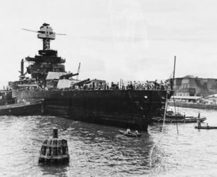 | Keywords: monochrome blackandwhite outdoor waterfront water vehicle boat black and white 80-G-19934: Japanese Attack on Pearl Harbor, Territory of Hawaii, 7 December 1941. USS West Virginia (BB 48), sunk at her berth by Japanese torpedoes and bombs, was sufficiently raised to drydock. She is being maneuvered by tugs, preliminary to the start of repairs. (4/7/2015). 80-G-19934: Japanese Attack on Pearl Harbor, Territory of Hawaii, 7 December 1941. USS West Virginia (BB 48), sunk at her berth by Japanese torpedoes and bombs, was sufficiently raised to drydock. She is being maneuvered by tugs, preliminary to the start of repairs. (4/7/2015). |