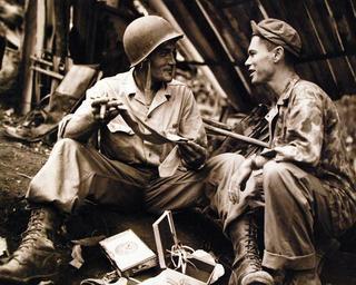 | Keywords: outdoor 80-G-205280: Major Harry L. Torgerson, left, U.S. Marine paratrooper famed for blasting Japanese out of Tulagi caves, opens a Christmas gift package and shows the contents to Technical Sargent Milburn McCarty, Jr., Marine Combat Correspondent. Within the shadow of the Major’s foxhole the two discuss possible uses of the new tie in the Bougainville Jungle, December 30, 1943. (7/14/2015). 80-G-205280: Major Harry L. Torgerson, left, U.S. Marine paratrooper famed for blasting Japanese out of Tulagi caves, opens a Christmas gift package and shows the contents to Technical Sargent Milburn McCarty, Jr., Marine Combat Correspondent. Within the shadow of the Major’s foxhole the two discuss possible uses of the new tie in the Bougainville Jungle, December 30, 1943. (7/14/2015). |