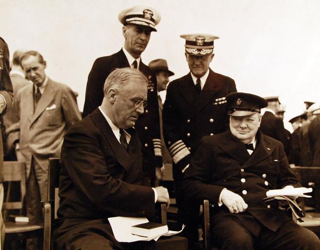 | Keywords: indoor 80-G-26865: Atlantic Charter, August 1941. Informal group photograph including President Franklin D. Roosevelt and Prime Minister Winston S. Churchill on deck of HMS Prince of Wales following church services during the Atlantic Charter. Left to right: Harry Hopkins; Admiral Ernest J. King; Admiral Harold R. Stark. Photograph released August 1941. U.S. Navy Photograph, now in the collections of the National Archives. (2016/03/22). 80-G-26865: Atlantic Charter, August 1941. Informal group photograph including President Franklin D. Roosevelt and Prime Minister Winston S. Churchill on deck of HMS Prince of Wales following church services during the Atlantic Charter. Left to right: Harry Hopkins; Admiral Ernest J. King; Admiral Harold R. Stark. Photograph released August 1941. U.S. Navy Photograph, now in the collections of the National Archives. (2016/03/22). |