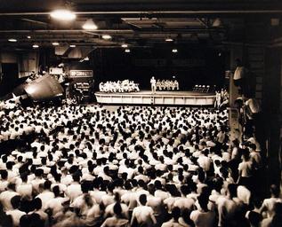 | Keywords: auditorium hall people crowd 80-G-294727: Crew of USS Wasp (CV 18) enjoy Christmas Eve Happy Hour performed by local talent. Received December 24, 1944. Official U.S. Navy Photograph, now in the collections of the National Archives. (2016/07/05). 80-G-294727: Crew of USS Wasp (CV 18) enjoy Christmas Eve Happy Hour performed by local talent. Received December 24, 1944. Official U.S. Navy Photograph, now in the collections of the National Archives. (2016/07/05). | ||||