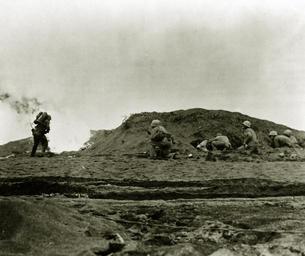 | Keywords: monochrome outdoor 80-G-304845: Battle for Iwo Jima, February-March 1945. A wave of Fourth Division Marines beginning an attack from the beach at Iwo Jima. A die-hard Japanese soldier gets a blast of liquid flame. Fifth Marine Division rifleman surround the dug-out ready to pour covering fire into the opening. The flame thrower, supported by covering rifle fire, has been a basic weapon in the cave to cave-battle on the volcanic rock. Photograph released February 19, 1945. U.S. Navy Photograph now in the collections of the National Archives. (2016/01/19). 80-G-304845: Battle for Iwo Jima, February-March 1945. A wave of Fourth Division Marines beginning an attack from the beach at Iwo Jima. A die-hard Japanese soldier gets a blast of liquid flame. Fifth Marine Division rifleman surround the dug-out ready to pour covering fire into the opening. The flame thrower, supported by covering rifle fire, has been a basic weapon in the cave to cave-battle on the volcanic rock. Photograph released February 19, 1945. U.S. Navy Photograph now in the collections of the National Archives. (2016/01/19). |