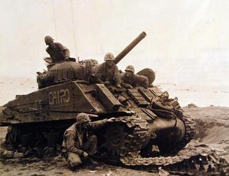 | Keywords: vehicle outdoor 80-G-304853: Battle for Iwo Jima, February-March 1945. This General Sherman tank on Iwo Jima was wrecked by a land mine and hit five times by Japanese artillery fire, but is Fourth Marine Division crew escaped without casualty. In turret, Sergeant James W. Reeses. Under the gun, left to right: Corporal Lynn S. Evans and Private First Class Lloyd F. Spickate. Charles H. Saulman is examining the damaged tread. Photographed released, February 26 1945. U.S. Navy Photograph now in the collections of the National Archives. (2016/01/19). 80-G-304853: Battle for Iwo Jima, February-March 1945. This General Sherman tank on Iwo Jima was wrecked by a land mine and hit five times by Japanese artillery fire, but is Fourth Marine Division crew escaped without casualty. In turret, Sergeant James W. Reeses. Under the gun, left to right: Corporal Lynn S. Evans and Private First Class Lloyd F. Spickate. Charles H. Saulman is examining the damaged tread. Photographed released, February 26 1945. U.S. Navy Photograph now in the collections of the National Archives. (2016/01/19). |