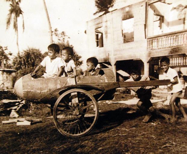 | Keywords: vehicle bike monochrome outdoor 80-G-320624: A Japanese bomber’s belly tank is mounted on wheels and used as a plaything by Guam children. The smiling youngsters are playing amid the ruins of Agana destroyed in fierce fighting between American and Japanese forces for possession of the island. Photographed May 12, 1945. Official U.S. Navy Photograph, now in the collections of the National Archives. (2016/07/05) 80-G-320624: A Japanese bomber’s belly tank is mounted on wheels and used as a plaything by Guam children. The smiling youngsters are playing amid the ruins of Agana destroyed in fierce fighting between American and Japanese forces for possession of the island. Photographed May 12, 1945. Official U.S. Navy Photograph, now in the collections of the National Archives. (2016/07/05) |