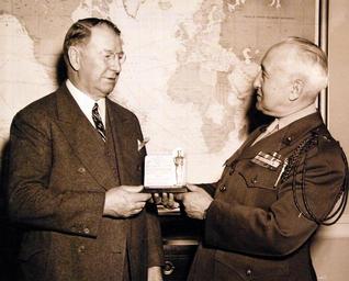 | Keywords: people indoor monochrome 80-G-41010: The Oscar plaques awarded to the U.S. Navy by the Motion Picture Academy of Arts and Sciences for the Official Navy film “Battle of Midway”, which was produced by Commandeer John Ford, USNR. Shown: Brigadier General R.L. Denig, (right), Public Relations Officer of the U.S. Marine Corps, who received the award in the name of the Navy, Marines, and Coast Guard at the annual dinner of the Academy in Los Angeles, California, on March 4, is shown delivering the statuette to the Secretary of the Navy at the Navy Department, Washington, April 1, 1943. Photograph released April 2, 1943. Official U.S. Navy Photograph, now in the collections of the National Archives. (2016/12/20). 80-G-41010: The Oscar plaques awarded to the U.S. Navy by the Motion Picture Academy of Arts and Sciences for the Official Navy film “Battle of Midway”, which was produced by Commandeer John Ford, USNR. Shown: Brigadier General R.L. Denig, (right), Public Relations Officer of the U.S. Marine Corps, who received the award in the name of the Navy, Marines, and Coast Guard at the annual dinner of the Academy in Los Angeles, California, on March 4, is shown delivering the statuette to the Secretary of the Navy at the Navy Department, Washington, April 1, 1943. Photograph released April 2, 1943. Official U.S. Navy Photograph, now in the collections of the National Archives. (2016/12/20). |
