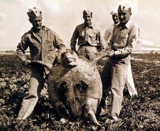 | Keywords: outdoor 80-G-414026: Naval Air Station, Banana River, Florida. Private First Class W. J. Gardner, USMC; Sergeant Harry Shult, USMC; R. Turner, USN and Sergeant Greco, USMC, with sea turtle on beach. Photograph released June 4, 1945. Official U.S. Navy photograph, now in the collections of the National Archives. (2016/11/15). 80-G-414026: Naval Air Station, Banana River, Florida. Private First Class W. J. Gardner, USMC; Sergeant Harry Shult, USMC; R. Turner, USN and Sergeant Greco, USMC, with sea turtle on beach. Photograph released June 4, 1945. Official U.S. Navy photograph, now in the collections of the National Archives. (2016/11/15). |