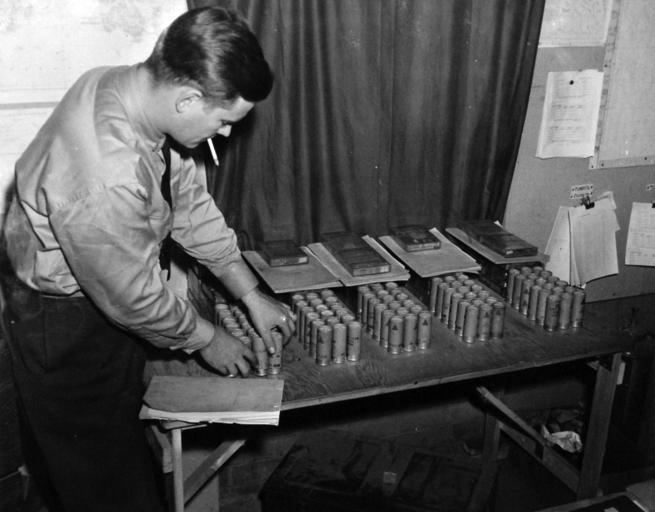 | Keywords: blackandwhite monochrome indoor black and white 80-G-44615 (TR-7039): Colors in cartridges – Air Intelligence Officer, Lieutenant Junior Grade Samuel D. Trusty prepares recognition flares, which are fired from very pistols (flare guns) in various color combinations according to code. Photograph released February 7, 1944. (2015/12/01). 80-G-44615 (TR-7039): Colors in cartridges – Air Intelligence Officer, Lieutenant Junior Grade Samuel D. Trusty prepares recognition flares, which are fired from very pistols (flare guns) in various color combinations according to code. Photograph released February 7, 1944. (2015/12/01). |