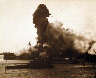 | Keywords: outdoor monochrome 80-G-6683: Pearl Harbor Attack, 7 December 1941. Forward magazines explode on USS Arizona (BB-39), after she was struck by a Japanese armor-piercing bomb. At far right is the mainmast of USS Oklahoma, heeled over sharply to port as she capsized. Slightly to the left of Oklahoma are the forward turrets of USS Tennessee (BB-43), with the rest of that ship covered by the blast from Arizona's explosion. At far left is the bow of USS Vestal (AR-4), moored outboard of Arizona. Official U.S. Navy Photograph, now in the collections of the National Archives. Also at NHHC. (2016/10/11). 80-G-6683: Pearl Harbor Attack, 7 December 1941. Forward magazines explode on USS Arizona (BB-39), after she was struck by a Japanese armor-piercing bomb. At far right is the mainmast of USS Oklahoma, heeled over sharply to port as she capsized. Slightly to the left of Oklahoma are the forward turrets of USS Tennessee (BB-43), with the rest of that ship covered by the blast from Arizona's explosion. At far left is the bow of USS Vestal (AR-4), moored outboard of Arizona. Official U.S. Navy Photograph, now in the collections of the National Archives. Also at NHHC. (2016/10/11). |