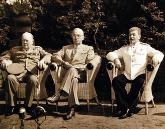 | Keywords: outdoor 80-G-700110: Potsdam Conference, 17 July – 2 August 1945. The “Big Three” at Potsdam, Germany, pose for a formal photograph in garden near the meeting palace. Left to right: Prime Minister Winston S. Churchill; President Harry S. Truman, and Premier Joseph Stalin. Photographed released July 25, 1945. U.S. Navy Photograph, now in the collections of the National Archives. (2016/02/23). 80-G-700110: Potsdam Conference, 17 July – 2 August 1945. The “Big Three” at Potsdam, Germany, pose for a formal photograph in garden near the meeting palace. Left to right: Prime Minister Winston S. Churchill; President Harry S. Truman, and Premier Joseph Stalin. Photographed released July 25, 1945. U.S. Navy Photograph, now in the collections of the National Archives. (2016/02/23). |