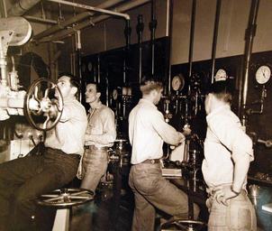 | Keywords: 80-G-706976: Navy Diving School, Washington, D.C. Harold Weisbrod, Navy diver, sets record for “Wet Tank” dive at the U.S. Naval Gun Factory, Washington, D.C. The decompression process was a long and intricate one for these members of the U.S. Naval Experimental Diving Unit as they decreased the pressure on their submerged mate, Weisbrod, while he was making a dive to a simulated depth of 561 feet. Crewmen, left to right: Chief Metalsmith Wesley Singleton who is manning the pressure controls; Chief Gunner’s Mate Kenneth Ploof, and a qualified master diver, who is directing the operation and keeping in verbal communication with Weisbrod; Hospitalman First Class Bob E. Wright, who is holding a stop watch to see that all changes in pressure are exactly in accordance with the decompression tables; and Boatswain’s Mate George B. Phillip, released 18 March 1949. U.S. Navy Photograph, now in the collections of the National Archives. (2016/06/14). 80-G-706976: Navy Diving School, Washington, D.C. Harold Weisbrod, Navy diver, sets record for “Wet Tank” dive at the U.S. Naval Gun Factory, Washington, D.C. The decompression process was a long and intricate one for these members of the U.S. Naval Experimental Diving Unit as they decreased the pressure on their submerged mate, Weisbrod, while he was making a dive to a simulated depth of 561 feet. Crewmen, left to right: Chief Metalsmith Wesley Singleton who is manning the pressure controls; Chief Gunner’s Mate Kenneth Ploof, and a qualified master diver, who is directing the operation and keeping in verbal communication with Weisbrod; Hospitalman First Class Bob E. Wright, who is holding a stop watch to see that all changes in pressure are exactly in accordance with the decompression tables; and Boatswain’s Mate George B. Phillip, released 18 March 1949. U.S. Navy Photograph, now in the collections of the National Archives. (2016/06/14). |