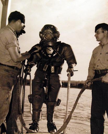 | Keywords: people 80-G-707443: Deep Sea Diving School, Naval Gun Factory, Washington, D.C. The standard Navy deep sea diver’s dress and equipment for diving-on-air weighs approximately 190 pounds. The weight is distributed as follows: Helmet 53lbs; Shoes 35lbs; lead-weighted belt 83lbs, rubberized waterproof suit, 18 lbs, released February 3, 1950. U.S. Navy Photograph, now in the collections of the National Archives. (2016/06/14). 80-G-707443: Deep Sea Diving School, Naval Gun Factory, Washington, D.C. The standard Navy deep sea diver’s dress and equipment for diving-on-air weighs approximately 190 pounds. The weight is distributed as follows: Helmet 53lbs; Shoes 35lbs; lead-weighted belt 83lbs, rubberized waterproof suit, 18 lbs, released February 3, 1950. U.S. Navy Photograph, now in the collections of the National Archives. (2016/06/14). |