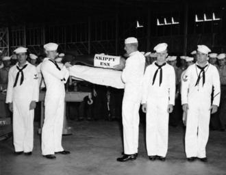 | Keywords: blackandwhite monochrome black and white 80-G-82604: Naval Air Station, Banana River, Florida, September 7, 1943. Funeral services for the mascot of Hedron 12. “Skippy” encased in empty bomb shell is placed on carrier to be hauled to plane. Official U.S. Navy photograph, now in the collections of the National Archives. (2016/10/04). 80-G-82604: Naval Air Station, Banana River, Florida, September 7, 1943. Funeral services for the mascot of Hedron 12. “Skippy” encased in empty bomb shell is placed on carrier to be hauled to plane. Official U.S. Navy photograph, now in the collections of the National Archives. (2016/10/04). |