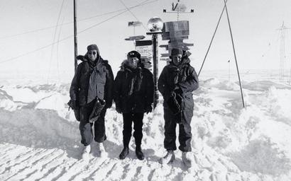 | Keywords: monochrome outdoor 80-G-K-87605: Rear Admiral David F. Welch, (center), Commander, U.S. Naval Support Force, Antarctica, and two companions stand beside the post marking the Geographical South Bole, at Amundsen-Scott, South-Pole Station, Antarctica. Photographed by PH1 William J. Galligan, October 31, 1970. NHHC Photographic Section. Black and White photograph only. (2015/10/30) 80-G-K-87605: Rear Admiral David F. Welch, (center), Commander, U.S. Naval Support Force, Antarctica, and two companions stand beside the post marking the Geographical South Bole, at Amundsen-Scott, South-Pole Station, Antarctica. Photographed by PH1 William J. Galligan, October 31, 1970. NHHC Photographic Section. Black and White photograph only. (2015/10/30) |