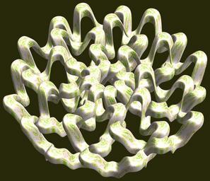 | Keywords: mathematica 3d cg parametricplot3d texture torus 輪環 りんかん ドーナツ どーなつ 六芒星 ろくぼうせい 六光星 ろくこうせい 六稜星 ろくりょうせい code program algorithm コード プログラム アルゴリズム hexagram geometric sculpture geometricsculpture shape geometry sculpture mapping テクスチャ マッピング 模様 もよう abstract 抽象 ちゅうしょう アブストラクト design pattern デザイン パターン graphic グラフィック グラフィクス structure 意匠 構造 symmetry 対称性 たいしょうせい シンメトリー 対称 たいしょう algorithm コード organic pattern black background blossom plant a = 6; (* center hole size of a torus *) b = 6; (* hexa-torus *) c = 6; (* distance from the center of rotation *) d = 8; (* number of torus *) h = 2; (* height of a torus *) SetOptions[ParametricPlot3D, PlotRange -> Full, Mesh -> None, Boxed -> False, Axes -> False, PlotPoints -> 400, ImageSize -> 3000, Background -> RGBColor[{40, 40, 10}/255], PlotStyle -> Directive[Specularity[White, 30], Texture[Import["D:/tmp/864.jpg"]]], TextureCoordinateFunction -> ({#4, #5 2 Pi} &), Lighting -> "Neutral"]; f[v_] := Sin[2 Sin[Sin[Sin[v]]]]; x = (a - Cos[t] - Sin[b s]) Cos[s + Pi/(2 b)] + c; y = (a - Cos[t] - Sin[b s]) Sin[s + Pi/(2 b)] + c; z = (f[t] - h f[b s]) + c; rot = Table[{x, y, z}.RotationMatrix[2 i Pi/d, {0, 0, 1}], {i, d}]; ParametricPlot3D[rot, {t, 0, 2 Pi}, {s, 0, 2 Pi}] (*--- The Texture *) a = 6; (* center hole size of a torus *) b = 6; (* hexa-torus *) c = 6; (* distance from the center of rotation *) d = 8; (* number of torus *) h = 2; (* height of a torus *) SetOptions[ParametricPlot3D, PlotRange -> Full, Mesh -> None, Boxed -> False, Axes -> False, PlotPoints -> 400, ImageSize -> 3000, Background -> RGBColor[{40, 40, 10}/255], PlotStyle -> Directive[Specularity[White, 30], Texture[Import["D:/tmp/864.jpg"]]], TextureCoordinateFunction -> ({#4, #5 2 Pi} &), Lighting -> "Neutral"]; f[v_] := Sin[2 Sin[Sin[Sin[v]]]]; x = (a - Cos[t] - Sin[b s]) Cos[s + Pi/(2 b)] + c; y = (a - Cos[t] - Sin[b s]) Sin[s + Pi/(2 b)] + c; z = (f[t] - h f[b s]) + c; rot = Table[{x, y, z}.RotationMatrix[2 i Pi/d, {0, 0, 1}], {i, d}]; ParametricPlot3D[rot, {t, 0, 2 Pi}, {s, 0, 2 Pi}] (*--- The Texture *) |