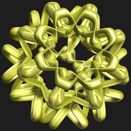 | Keywords: mathematica 3d cg parametricplot3d texture torus 輪環 りんかん ドーナツ どーなつ 八芒星 はちぼうせい 八光星 はちこうせい 八稜星 はちりょうせい code program algorithm コード プログラム アルゴリズム geometric sculpture geometricsculpture shape geometry sculpture mapping テクスチャ マッピング 模様 もよう abstract 抽象 ちゅうしょう アブストラクト design pattern デザイン パターン graphic グラフィック グラフィクス structure 意匠 構造 symmetry 対称性 たいしょうせい シンメトリー 対称 たいしょう algorithm コード black background indoor organic pattern a = 10; (* center hole size of a torus *) b = 8; (* octa-torus *) c = -4; (* distance from the center of rotation *) d = 8; (* number of torus *) h = 2; (* height of a torus *) SetOptions[ParametricPlot3D, PlotRange -> Full, Mesh -> None, Boxed -> False, Axes -> False, PlotPoints -> 400, ImageSize -> 3000, Background -> RGBColor[{30, 30, 30}/255], PlotStyle -> Directive[Specularity[White, 30], Texture[Import["D:/tmp/71.jpg"]]], TextureCoordinateFunction -> ({#4 + #5, #5/Pi} &), Lighting -> "Neutral"]; f[v_] := Sin[2 Sin[Sin[Sin[v]]]]; x = (a - Cos[t] - f[b s]) Cos[s + Pi/(2 b)]; y = (a - Cos[t] - f[b s]) Sin[s + Pi/(2 b)]; z = (a - Sin[t] - h f[b s]) + c; rm = Table[{x, y, z}.RotationMatrix[2 i Pi/d, {1, 0, 0}], {i, d}]; ParametricPlot3D[rm, {t, 0, 2 Pi}, {s, 0, 2 Pi}] (*--- The Texture *) a = 10; (* center hole size of a torus *) b = 8; (* octa-torus *) c = -4; (* distance from the center of rotation *) d = 8; (* number of torus *) h = 2; (* height of a torus *) SetOptions[ParametricPlot3D, PlotRange -> Full, Mesh -> None, Boxed -> False, Axes -> False, PlotPoints -> 400, ImageSize -> 3000, Background -> RGBColor[{30, 30, 30}/255], PlotStyle -> Directive[Specularity[White, 30], Texture[Import["D:/tmp/71.jpg"]]], TextureCoordinateFunction -> ({#4 + #5, #5/Pi} &), Lighting -> "Neutral"]; f[v_] := Sin[2 Sin[Sin[Sin[v]]]]; x = (a - Cos[t] - f[b s]) Cos[s + Pi/(2 b)]; y = (a - Cos[t] - f[b s]) Sin[s + Pi/(2 b)]; z = (a - Sin[t] - h f[b s]) + c; rm = Table[{x, y, z}.RotationMatrix[2 i Pi/d, {1, 0, 0}], {i, d}]; ParametricPlot3D[rm, {t, 0, 2 Pi}, {s, 0, 2 Pi}] (*--- The Texture *) |