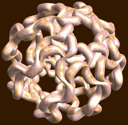 Keywords: mathematica 3d cg parametricplot3d texture torus 輪環 りんかん ドーナツ どーなつ 八芒星 はちぼうせい 八光星 はちこうせい 八稜星 はちりょうせい code program algorithm コード プログラム アルゴリズム geometric sculpture geometricsculpture shape geometry sculpture mapping テクスチャ マッピング 模様 もよう abstract 抽象 ちゅうしょう アブストラクト design pattern デザイン パターン graphic グラフィック グラフィクス structure 意匠 構造 symmetry 対称性 たいしょうせい シンメトリー 対称 たいしょう algorithm コード black background indoor food a = 12; (* center hole size of a torus *) b = 8; (* octa-torus *) c = -16; (* distance from the center of rotation *) d = 8; (* number of torus *) h = 1; (* height of a torus *) SetOptions[ParametricPlot3D, PlotRange -> Full, Mesh -> None, Boxed -> False, Axes -> False, PlotPoints -> 400, ImageSize -> 3000, Background -> Darker[Orange, 0.8], PlotStyle -> Directive[Specularity[White, 30], Texture[Import["D:/tmp/861.jpg"]]], TextureCoordinateFunction -> ({#4, #5 2 Pi} &), Lighting -> "Neutral"]; f[v_] := Sin[2 Sin[Sin[Sin[v]]]]; x = (a - Cos[t] - f[b s]) Cos[s + Pi/b]; y = (a - Cos[t] - f[b s]) Sin[s + Pi/b]; z = (a - Sin[t] - h f[b s]) + c; rm = Table[{x, y, z}.RotationMatrix[2 i Pi/d, {1, 1, 0}], {i, d}]; ParametricPlot3D[rm, {t, 0, 2 Pi}, {s, 0, 2 Pi}] (*--- The Texture *) a = 12; (* center hole size of a torus *) b = 8; (* octa-torus *) c = -16; (* distance from the center of rotation *) d = 8; (* number of torus *) h = 1; (* height of a torus *) SetOptions[ParametricPlot3D, PlotRange -> Full, Mesh -> None, Boxed -> False, Axes -> False, PlotPoints -> 400, ImageSize -> 3000, Background -> Darker[Orange, 0.8], PlotStyle -> Directive[Specularity[White, 30], Texture[Import["D:/tmp/861.jpg"]]], TextureCoordinateFunction -> ({#4, #5 2 Pi} &), Lighting -> "Neutral"]; f[v_] := Sin[2 Sin[Sin[Sin[v]]]]; x = (a - Cos[t] - f[b s]) Cos[s + Pi/b]; y = (a - Cos[t] - f[b s]) Sin[s + Pi/b]; z = (a - Sin[t] - h f[b s]) + c; rm = Table[{x, y, z}.RotationMatrix[2 i Pi/d, {1, 1, 0}], {i, d}]; ParametricPlot3D[rm, {t, 0, 2 Pi}, {s, 0, 2 Pi}] (*--- The Texture *) |