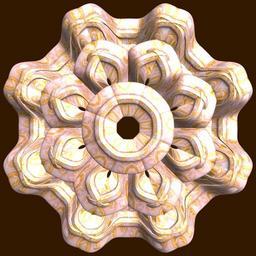 | Keywords: mathematica 3d cg parametricplot3d texture torus 輪環 りんかん ドーナツ どーなつ 五芒星 ごぼうせい 五光星 ごこうせい 五稜星 ごりょうせい code program algorithm コード プログラム アルゴリズム pentagram geometric sculpture geometricsculpture shape geometry sculpture mapping テクスチャ マッピング 模様 もよう abstract 抽象 ちゅうしょう アブストラクト design pattern デザイン パターン graphic グラフィック グラフィクス structure 意匠 構造 symmetry 対称性 たいしょうせい シンメトリー 対称 たいしょう algorithm コード indoor black background ancient a = 6; (* center hole size of a torus *) b = 5; (* penta-torus *) c = 3; (* distance from the center of rotation *) d = 8; (* number of torus *) h = 1; (* height of a torus *) SetOptions[ParametricPlot3D, PlotRange -> Full, Mesh -> None, Boxed -> False, Axes -> False, PlotPoints -> 400, ImageSize -> 3000, Background -> Darker[Orange, 0.8], PlotStyle -> Directive[Specularity[White, 30], Texture[Import["D:/tmp/861.jpg"]]], TextureCoordinateFunction -> ({#4, #5 2 Pi} &), Lighting -> "Neutral"]; f[v_] := Sin[2 Sin[Sin[Sin[v]]]]; g[v_] := Sum[Cos[(2 k - 1) v]/(2 k - 1), {k, 4}]; x = (a - g[t] - f[b s]) Cos[s + 3 Pi/(4 b)] + c; y = (a - g[t] - f[b s]) Sin[s + 3 Pi/(4 b)] + c; z = (a - Sin[t] - h f[b s]); rot = Table[{x, y, z}.RotationMatrix[2 i Pi/d, {0, 0, 1}], {i, d}]; ParametricPlot3D[rot, {t, 0, 2 Pi}, {s, 0, 2 Pi}] (*--- The Texture *) a = 6; (* center hole size of a torus *) b = 5; (* penta-torus *) c = 3; (* distance from the center of rotation *) d = 8; (* number of torus *) h = 1; (* height of a torus *) SetOptions[ParametricPlot3D, PlotRange -> Full, Mesh -> None, Boxed -> False, Axes -> False, PlotPoints -> 400, ImageSize -> 3000, Background -> Darker[Orange, 0.8], PlotStyle -> Directive[Specularity[White, 30], Texture[Import["D:/tmp/861.jpg"]]], TextureCoordinateFunction -> ({#4, #5 2 Pi} &), Lighting -> "Neutral"]; f[v_] := Sin[2 Sin[Sin[Sin[v]]]]; g[v_] := Sum[Cos[(2 k - 1) v]/(2 k - 1), {k, 4}]; x = (a - g[t] - f[b s]) Cos[s + 3 Pi/(4 b)] + c; y = (a - g[t] - f[b s]) Sin[s + 3 Pi/(4 b)] + c; z = (a - Sin[t] - h f[b s]); rot = Table[{x, y, z}.RotationMatrix[2 i Pi/d, {0, 0, 1}], {i, d}]; ParametricPlot3D[rot, {t, 0, 2 Pi}, {s, 0, 2 Pi}] (*--- The Texture *) |