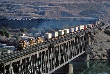 | Keywords: santa fe santafe at&sf atsf outdoor skyline architecture building structure infrastructure building Roger Puta took these in January 1983 at the AT&SF Colorado River Bridge. The River is the Arizona/California border. He was on a hill in California where he could look at the bridge and across to Arizona and shoot westbounds ore he could turn around looking toward Needles, CA and shoot eastbounds. This sequence has one eastbound and three westbounds. 1. and 2. AT&SF SD40-2 5150 westbound with mainly TOFC. Roger Puta took these in January 1983 at the AT&SF Colorado River Bridge. The River is the Arizona/California border. He was on a hill in California where he could look at the bridge and across to Arizona and shoot westbounds ore he could turn around looking toward Needles, CA and shoot eastbounds. This sequence has one eastbound and three westbounds. 1. and 2. AT&SF SD40-2 5150 westbound with mainly TOFC. |