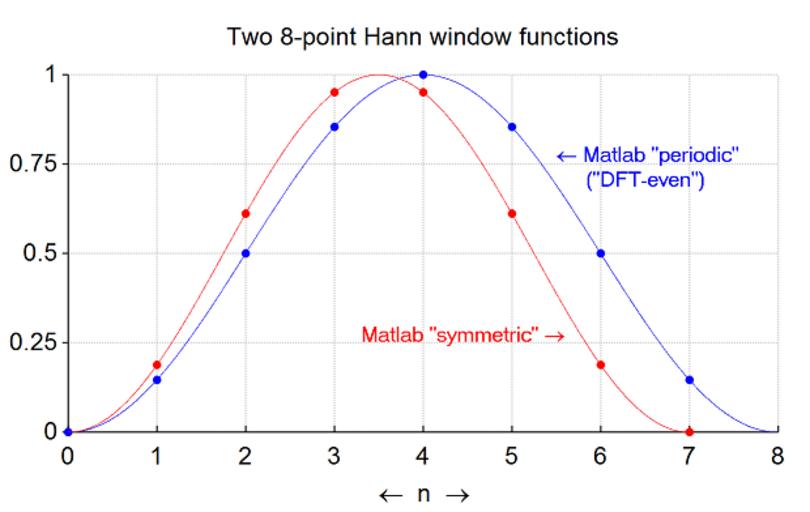 Keywords: 8-point Hann windows.png en We illustrate two different ways to generate Hann window functions for spectral analysis applications MATLAB calls them symmetric and periodic The latter is also called DFT Even in the classic Frederic Harris paper 2016-04-05 own Bob K Octave script <source lang Matlab > pkg load signal graphics_toolkit gnuplot L 5600; window hann L ; N 8; window size in samples dx L-1 / N-1 ; decimation factor for 7 hops symmetric window 1+ 0 7 dx dx L-1 /N; decimation factor for 8 hops periodic window 1+ 0 7 dx ; but discard the last one Replace above with the equivalent formulaic versions symmetric 5 1-cos 2 pi 0 N-1 / N-1 ; periodic 5 1-cos 2 pi 0 N-1 /N ; aka DFT Even Compare equivalent noise bandwidths info only ENBW_symmetric N sum symmetric 2 /sum symmetric 2 ENBW_periodic N sum periodic 2 /sum periodic 2 figure plot 0 7 symmetric 'color' 'red' ' ' plot the symmetric coefficients box off no border around plot hold on same axes for next 3 plots plot 0 7 periodic 'color' 'blue' ' ' plot the periodic coefficients connect the dots x 0 L-1 N/L; plot x window 'color' 'blue' periodic x 0 L-1 N-1 /L; plot x window 'color' 'red' symmetric xlim 0 8 set gca 'FontSize' 14 set gca yaxislocation zero set gca 'xgrid' 'on' ; set gca 'ygrid' 'on' ; set gca 'ytick' 0 25 1 ; set gca 'xtick' 0 8 ; text 3 3 0 27 'Matlab symmetric \rightarrow' 'color' 'red' 'FontSize' 12 str '\leftarrow Matlab periodic ' ' DFT-even ' ; text 5 5 0 74 str 'color' 'blue' 'FontSize' 12 title 'Two 8-point Hann window functions' 'FontSize' 14 ; xlabel '\leftarrow n \rightarrow' </source> cc-zero Original upload log wikitable - - 2013-08-27 04 03 10 636 × 374 12992 bytes Bob K User created page with UploadWizard Digital signal processing |