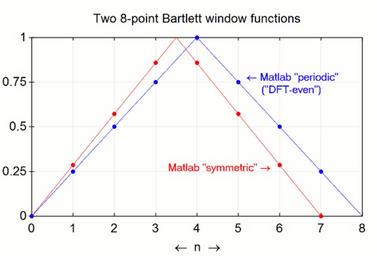 | Keywords: 8-point windows.gif en We illustrate two different ways to generate triangular window functions for spectral analysis applications MATLAB calls them symmetric and periodic The latter is also called DFT Even in the classic Frederic Harris paper 2016-04-05 own Bob K Octave script <source lang Matlab > pkg load signal graphics_toolkit gnuplot L 5600; window triang L ; N 8; window size in samples dx L-1 / N-1 ; decimation factor for 7 hops symmetric window 1+ 0 7 dx ; dx L-1 /N; decimation factor for 8 hops periodic window 1+ 0 7 dx ; but discard the last one Compare equivalent noise bandwidths info only ENBW_symmetric N sum symmetric 2 /sum symmetric 2 ENBW_periodic N sum periodic 2 /sum periodic 2 figure plot 0 7 symmetric 'color' 'red' ' ' plot the symmetric coefficients hold on same axes for next 3 plots plot 0 7 periodic 'color' 'blue' ' ' plot the periodic coefficients Connect the dots x 0 L-1 N/L; plot x window 'color' 'blue' periodic x 0 L-1 N-1 /L; plot x window 'color' 'red' symmetric xlim 0 8 set gca 'FontSize' 14 set gca yaxislocation zero set gca 'xgrid' 'on' ; set gca 'ygrid' 'on' ; set gca 'ytick' 0 25 1 ; set gca 'xtick' 0 8 ; text 3 3 0 27 'Matlab symmetric \rightarrow' 'color' 'red' 'FontSize' 12 str '\leftarrow Matlab periodic ' ' DFT-even ' ; text 5 2 0 74 str 'color' 'blue' 'FontSize' 12 title 'Two 8-point Bartlett window functions' 'FontSize' 14 ; xlabel '\leftarrow n \rightarrow' </source> cc-zero Digital signal processing |