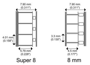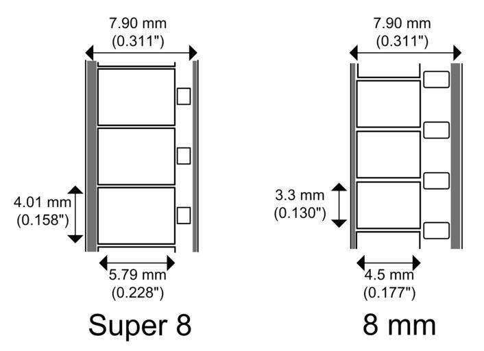 | Keywords: 8mm and super8.png Not quite consistent with format specifications from here http //gcmstudio com/filmspecs/filmspecs html Especially the copy of the SMPTE document look trustworthy Film width 7 976 mm +- 0 038 mm Perforation pitch long 4 234 mm +- 0 010 mm Perforation pitch short 4 227 mm +- 0 010 mm Perforation width 0 914 mm +- 0 010 mm Perforation height 1 143 mm +- 0 010 mm Edge to Perforation 0 51 mm +- 0 05 mm Radius of Per fillet 0 13 mm +- 0 03 mm en Super 8 and 8 mm film formats side by side Magnetic stripes are indicated in gray; the wide stripe is the actual sound track the narrow stripe is a balance stripe enabling smooth movement and rolling-up of the film Own Myself Max Smith Error fix Mag stripes by User Janke 2009-06-21 Release all rights into the public domain but an image credit would be nice Sizes taken from various inconsistent sources - if you have better numbers - please drop a note on my source page 8 mm movie cameras |