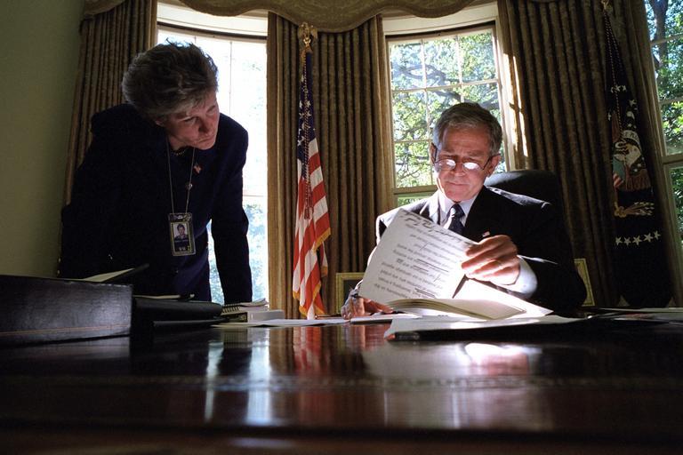 | Keywords: washington d.c. dc u.s. national archives usnationalarchives 9/11 911 president george w. bush presidentgeorgewbush nara:arcid=5997369 karen hughes karenhughes oval office ovaloffice white house whitehouse 2001 george w. bush presidential library georgewbushpresidentiallibrary Original Caption: President George W. Bush looks over a brief with Karen Hughes, Counselor to the President, in the Oval Office of the White House. U.S. National Archives’ Local Identifier: P8233-12 Created By: President (2001-2009 : Bush). Office of Management and Administration. Office of White House Management. Photography Office. (01/20/2001 - 01/20/2009) From: Photographs Related to the George W. Bush Administration, compiled 01/20/2001 - 01/20/2009 Production Dates: 10/08/2001 Persistent URL: arcweb.archives.gov/arc/action/ExternalIdSearch?id=5997369 Repository: George W. Bush Library (Lewisville, TX) Access Restrictions: Unrestricted Use Restrictions: Unrestricted Original Caption: President George W. Bush looks over a brief with Karen Hughes, Counselor to the President, in the Oval Office of the White House. U.S. National Archives’ Local Identifier: P8233-12 Created By: President (2001-2009 : Bush). Office of Management and Administration. Office of White House Management. Photography Office. (01/20/2001 - 01/20/2009) From: Photographs Related to the George W. Bush Administration, compiled 01/20/2001 - 01/20/2009 Production Dates: 10/08/2001 Persistent URL: arcweb.archives.gov/arc/action/ExternalIdSearch?id=5997369 Repository: George W. Bush Library (Lewisville, TX) Access Restrictions: Unrestricted Use Restrictions: Unrestricted |