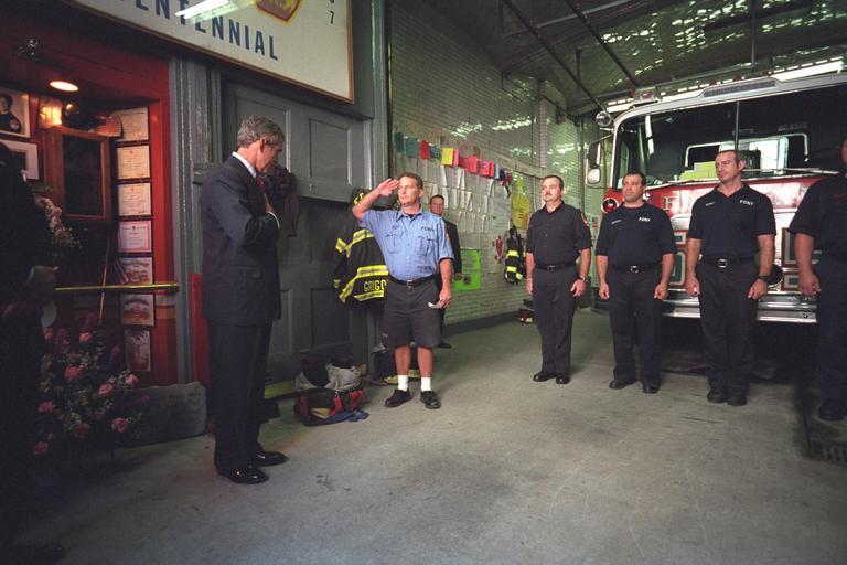 MAKE A MEME View Large Image Original Caption: President George W. Bush visits with firefighters at Engine Co. 55 in New York City. U.S. National Archives’ Local Identifier: P8051-06 Created By: President (2001-2009 : Bush). Office of Management and Administration. ...