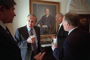 | Keywords: washington d.c. dc u.s. national archives usnationalarchives president george w. bush presidentgeorgewbush 9/11 911 nara:arcid=5997269 george w. bush presidential library georgewbushpresidentiallibrary cabinet room cabinetroom white house whitehouse 2001secretary of defense 2001secretaryofdefense donald rumsfeld donaldrumsfeld secretary of state secretaryofstate colin powell colinpowell lewis libby lewislibby paul wolfowitz paulwolfowitz 2001 people indoor groupshot Original Caption: Defense Under Secretary Paul Wolfowitz talks with, from left, Donald Rumsfeld, Secretary of Defense; Colin Powell, Secretary of State; and Lewis Libby, Chief of Staff for the Vice President in the Cabinet Room of the White House. U.S. National Archives’ Local Identifier: P7188-17 Created By: President (2001-2009 : Bush). Office of Management and Administration. Office of White House Management. Photography Office. (01/20/2001 - 01/20/2009) From: Photographs Related to the George W. Bush Administration, compiled 01/20/2001 - 01/20/2009 Production Dates: 09/12/2001 Persistent URL: arcweb.archives.gov/arc/action/ExternalIdSearch?id=5997269 Repository: George W. Bush Library (Lewisville, TX) Access Restrictions: Unrestricted Use Restrictions: Unrestricted Original Caption: Defense Under Secretary Paul Wolfowitz talks with, from left, Donald Rumsfeld, Secretary of Defense; Colin Powell, Secretary of State; and Lewis Libby, Chief of Staff for the Vice President in the Cabinet Room of the White House. U.S. National Archives’ Local Identifier: P7188-17 Created By: President (2001-2009 : Bush). Office of Management and Administration. Office of White House Management. Photography Office. (01/20/2001 - 01/20/2009) From: Photographs Related to the George W. Bush Administration, compiled 01/20/2001 - 01/20/2009 Production Dates: 09/12/2001 Persistent URL: arcweb.archives.gov/arc/action/ExternalIdSearch?id=5997269 Repository: George W. Bush Library (Lewisville, TX) Access Restrictions: Unrestricted Use Restrictions: Unrestricted |