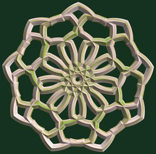 Keywords: mathematica 3d cg parametricplot3d texture torus code program algorithm プログラム コード アルゴリズム 輪環 りんかん ドーナツ どーなつ 六芒星 ろくぼうせい geometric sculpture geometricsculpture shape geometry sculpture mapping テクスチャ マッピング 模様 もよう abstract 抽象 ちゅうしょう アブストラクト design pattern デザイン パターン graphic グラフィック グラフィクス structure 意匠 構造 symmetry 対称性 たいしょうせい シンメトリー 対称 たいしょう organic pattern tangle black background a = 9; (* center hole size *) b = 6; (* hexa-torus *) c = 6; (* distance from the center of rotation *) d = 9; (* number of torus *) h = 0; (* height of a torus *) SetOptions[ParametricPlot3D, PlotRange -> Full, Mesh -> None, Boxed -> False, Axes -> False, PlotPoints -> 400, ImageSize -> 3000, Background -> RGBColor[{20, 50, 30}/255], PlotStyle -> Directive[Specularity[White, 40], Texture[Import["D:/tmp/862.jpg"]]], TextureCoordinateFunction -> ({#4 + #5, #5 / Pi} &), Lighting -> "Neutral"]; f[v_] := TriangleWave[{-1, 1}, v/(2 Pi)]; g[v_] := TriangleWave[{-1, 1}, v/(2 Pi) + 1/4]; x = (a - g[t] - f[b s]) Cos[s] + c; y = (a - g[t] - f[b s]) Sin[s] + c; z = (a - f[t] - h f[b s]); rm = Table[{x, y, z}.RotationMatrix[2 i Pi/d, {0, 0, 1}], {i, d}]; ParametricPlot3D[rm, {t, 0, 2 Pi}, {s, 0, Pi}] (*--- The Texture *) a = 9; (* center hole size *) b = 6; (* hexa-torus *) c = 6; (* distance from the center of rotation *) d = 9; (* number of torus *) h = 0; (* height of a torus *) SetOptions[ParametricPlot3D, PlotRange -> Full, Mesh -> None, Boxed -> False, Axes -> False, PlotPoints -> 400, ImageSize -> 3000, Background -> RGBColor[{20, 50, 30}/255], PlotStyle -> Directive[Specularity[White, 40], Texture[Import["D:/tmp/862.jpg"]]], TextureCoordinateFunction -> ({#4 + #5, #5 / Pi} &), Lighting -> "Neutral"]; f[v_] := TriangleWave[{-1, 1}, v/(2 Pi)]; g[v_] := TriangleWave[{-1, 1}, v/(2 Pi) + 1/4]; x = (a - g[t] - f[b s]) Cos[s] + c; y = (a - g[t] - f[b s]) Sin[s] + c; z = (a - f[t] - h f[b s]); rm = Table[{x, y, z}.RotationMatrix[2 i Pi/d, {0, 0, 1}], {i, d}]; ParametricPlot3D[rm, {t, 0, 2 Pi}, {s, 0, Pi}] (*--- The Texture *) |