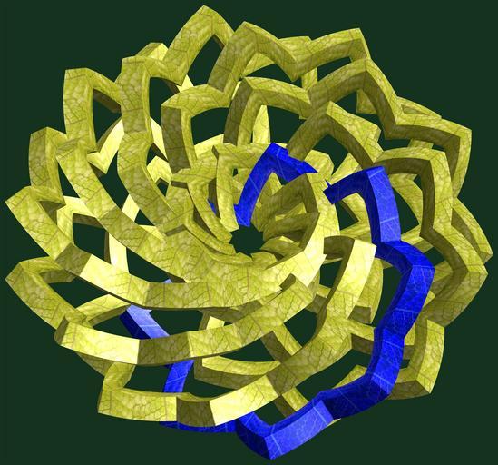 Keywords: mathematica 3d cg parametricplot3d texture torus code program algorithm プログラム コード アルゴリズム 輪環 りんかん ドーナツ どーなつ 八芒星 はちぼうせい geometric sculpture geometricsculpture shape geometry sculpture mapping テクスチャ マッピング 模様 もよう abstract 抽象 ちゅうしょう アブストラクト design pattern デザイン パターン graphic グラフィック グラフィクス structure 意匠 構造 symmetry 対称性 たいしょうせい シンメトリー 対称 たいしょう black background a = 8; (* center hole size *) b = 8; (* octa-torus *) c = 5; (* distance from the center of rotation *) d = 9; (* number of torus *) h = 1; (* height of a torus *) SetOptions[ParametricPlot3D, PlotRange -> Full, Mesh -> None, Boxed -> False, Axes -> False, PlotPoints -> 400, ImageSize -> 3000, Background -> RGBColor[{20, 50, 30}/255], PlotStyle -> Table[Directive[Specularity[White, 30], Texture[Import[fullpath]]], {fullpath, Flatten[{"D:/tmp/713.jpg", Table["D:/tmp/71.jpg", {d - 1}]}]}], TextureCoordinateFunction -> ({#4, #5 Pi} &), Lighting -> "Neutral"]; f[v_] := TriangleWave[{-1, 1}, v/(2 Pi)]; g[v_] := TriangleWave[{-1, 1}, v/(2 Pi) + 1/4]; x = (a - g[t] - f[b s]) Cos[s] + c; y = (a - g[t] - f[b s]) Sin[s] + c; z = (a - f[t] - h f[b s]); rm = Table[{x, y, z}.RotationMatrix[2 i Pi/d, {0, 1, 2}], {i, d}]; ParametricPlot3D[rm, {t, 0, 2 Pi}, {s, 0, Pi}] (*--- The Texture *) a = 8; (* center hole size *) b = 8; (* octa-torus *) c = 5; (* distance from the center of rotation *) d = 9; (* number of torus *) h = 1; (* height of a torus *) SetOptions[ParametricPlot3D, PlotRange -> Full, Mesh -> None, Boxed -> False, Axes -> False, PlotPoints -> 400, ImageSize -> 3000, Background -> RGBColor[{20, 50, 30}/255], PlotStyle -> Table[Directive[Specularity[White, 30], Texture[Import[fullpath]]], {fullpath, Flatten[{"D:/tmp/713.jpg", Table["D:/tmp/71.jpg", {d - 1}]}]}], TextureCoordinateFunction -> ({#4, #5 Pi} &), Lighting -> "Neutral"]; f[v_] := TriangleWave[{-1, 1}, v/(2 Pi)]; g[v_] := TriangleWave[{-1, 1}, v/(2 Pi) + 1/4]; x = (a - g[t] - f[b s]) Cos[s] + c; y = (a - g[t] - f[b s]) Sin[s] + c; z = (a - f[t] - h f[b s]); rm = Table[{x, y, z}.RotationMatrix[2 i Pi/d, {0, 1, 2}], {i, d}]; ParametricPlot3D[rm, {t, 0, 2 Pi}, {s, 0, Pi}] (*--- The Texture *) |