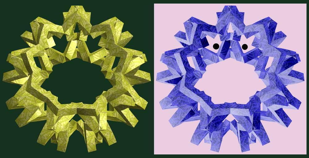 Keywords: mathematica 3d cg parametricplot3d texture torus code program algorithm プログラム コード アルゴリズム 輪環 りんかん ドーナツ どーなつ 八芒星 はちぼうせい geometric sculpture geometricsculpture shape geometry sculpture mapping テクスチャ マッピング 模様 もよう abstract 抽象 ちゅうしょう アブストラクト design pattern デザイン パターン graphic グラフィック グラフィクス structure 意匠 構造 symmetry 対称性 たいしょうせい シンメトリー 対称 たいしょう foliage plant leaf a = 8; (* center hole size *) b = 8; (* octa-torus *) c = -1; (* distance from the center of rotation *) d = 9; (* number of torus *) h = 1; (* height of a torus *) SetOptions[ParametricPlot3D, PlotRange -> Full, Mesh -> None, Boxed -> False, Axes -> False, PlotPoints -> 400, ImageSize -> 3000, Background -> RGBColor[{20, 50, 30}/255], PlotStyle -> Directive[Specularity[White, 30], Texture[Import["D:/tmp/71.jpg"]]], TextureCoordinateFunction -> ({#4, #5 Pi} &), Lighting -> "Neutral"]; f[v_] := TriangleWave[{-1, 1}, v/(2 Pi)]; g[v_] := TriangleWave[{-1, 1}, v/(2 Pi) + 1/4]; x = (a - g[t] - f[b s]) Cos[s + Pi/(2 b)]; y = (a - g[t] - f[b s]) Sin[s + Pi/(2 b)]; z = (a - f[t] - h f[b s]) + c; rm = Table[{x, y, z}.RotationMatrix[2 i Pi/d, {1, 1, 0}], {i, d}]; ParametricPlot3D[rm, {t, 0, 2 Pi}, {s, 0, Pi}] (*--- The Texture *) a = 8; (* center hole size *) b = 8; (* octa-torus *) c = -1; (* distance from the center of rotation *) d = 9; (* number of torus *) h = 1; (* height of a torus *) SetOptions[ParametricPlot3D, PlotRange -> Full, Mesh -> None, Boxed -> False, Axes -> False, PlotPoints -> 400, ImageSize -> 3000, Background -> RGBColor[{20, 50, 30}/255], PlotStyle -> Directive[Specularity[White, 30], Texture[Import["D:/tmp/71.jpg"]]], TextureCoordinateFunction -> ({#4, #5 Pi} &), Lighting -> "Neutral"]; f[v_] := TriangleWave[{-1, 1}, v/(2 Pi)]; g[v_] := TriangleWave[{-1, 1}, v/(2 Pi) + 1/4]; x = (a - g[t] - f[b s]) Cos[s + Pi/(2 b)]; y = (a - g[t] - f[b s]) Sin[s + Pi/(2 b)]; z = (a - f[t] - h f[b s]) + c; rm = Table[{x, y, z}.RotationMatrix[2 i Pi/d, {1, 1, 0}], {i, d}]; ParametricPlot3D[rm, {t, 0, 2 Pi}, {s, 0, Pi}] (*--- The Texture *) |