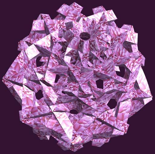 Keywords: mathematica 3d cg parametricplot3d texture torus code program algorithm プログラム コード アルゴリズム 輪環 りんかん ドーナツ どーなつ 八芒星 はちぼうせい geometric sculpture geometricsculpture shape geometry sculpture mapping テクスチャ マッピング 模様 もよう abstract 抽象 ちゅうしょう アブストラクト design pattern デザイン パターン graphic グラフィック グラフィクス structure 意匠 構造 symmetry 対称性 たいしょうせい シンメトリー 対称 たいしょう black background plant blossom flower cluster flower a = 8; (* center hole size *) b = 8; (* octa-torus *) c = -8; (* distance from the center of rotation *) d = 9; (* number of torus *) h = 2; (* height of a torus *) SetOptions[ParametricPlot3D, PlotRange -> Full, Mesh -> None, Boxed -> False, Axes -> False, PlotPoints -> 400, ImageSize -> 3000, Background -> RGBColor[{50, 20, 50}/255], PlotStyle -> Directive[Specularity[White, 30], Texture[Import["D:/tmp/92.jpg"]]], TextureCoordinateFunction -> ({#4, #5 Pi} &), Lighting -> "Neutral"]; f[v_] := TriangleWave[{-1, 1}, v/(2 Pi)]; g[v_] := TriangleWave[{-1, 1}, v/(2 Pi) + 1/4]; x = (a - g[t] - f[b s]) Cos[s + Pi/(2 b)]; y = (a - g[t] - f[b s]) Sin[s + Pi/(2 b)]; z = (a - f[t] - h f[b s]) + c; rm = Table[{x, y, z}.RotationMatrix[2 i Pi/d, {1, 1, 0}], {i, d}]; ParametricPlot3D[rm, {t, 0, 2 Pi}, {s, 0, Pi}] (*--- The Texture *) a = 8; (* center hole size *) b = 8; (* octa-torus *) c = -8; (* distance from the center of rotation *) d = 9; (* number of torus *) h = 2; (* height of a torus *) SetOptions[ParametricPlot3D, PlotRange -> Full, Mesh -> None, Boxed -> False, Axes -> False, PlotPoints -> 400, ImageSize -> 3000, Background -> RGBColor[{50, 20, 50}/255], PlotStyle -> Directive[Specularity[White, 30], Texture[Import["D:/tmp/92.jpg"]]], TextureCoordinateFunction -> ({#4, #5 Pi} &), Lighting -> "Neutral"]; f[v_] := TriangleWave[{-1, 1}, v/(2 Pi)]; g[v_] := TriangleWave[{-1, 1}, v/(2 Pi) + 1/4]; x = (a - g[t] - f[b s]) Cos[s + Pi/(2 b)]; y = (a - g[t] - f[b s]) Sin[s + Pi/(2 b)]; z = (a - f[t] - h f[b s]) + c; rm = Table[{x, y, z}.RotationMatrix[2 i Pi/d, {1, 1, 0}], {i, d}]; ParametricPlot3D[rm, {t, 0, 2 Pi}, {s, 0, Pi}] (*--- The Texture *) |