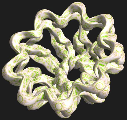 Keywords: mathematica 3d cg parametricplot3d texture torus 輪環 りんかん ドーナツ どーなつ 五芒星 ごぼうせい 五光星 ごこうせい 五稜星 ごりょうせい code program algorithm コード プログラム アルゴリズム pentagram geometric sculpture geometricsculpture shape geometry sculpture mapping テクスチャ マッピング 模様 もよう abstract 抽象 ちゅうしょう アブストラクト design pattern デザイン パターン graphic グラフィック グラフィクス structure 意匠 構造 symmetry 対称性 たいしょうせい シンメトリー 対称 たいしょう algorithm コード black background indoor organic pattern a = 6; (* center hole size of a torus *) b = 5; (* penta-torus *) c = 8; (* distance from the center of rotation *) d = 9; (* number of torus *) h = 1; (* height of a torus *) SetOptions[ParametricPlot3D, PlotRange -> Full, Mesh -> None, Boxed -> False, Axes -> False, PlotPoints -> 300, ImageSize -> 3000, Background -> RGBColor[{30, 30, 30}/255], PlotStyle -> Directive[Specularity[White, 70], Texture[Import["D:/tmp/864.jpg"]]], TextureCoordinateFunction -> ({#4, #5 2 Pi} &), Lighting -> "Neutral"]; f[v_] := Sin[2 Sin[Sin[Sin[v]]]]; x = (a - Cos[t] - Sin[b s]) Cos[s + Pi/(2 b)]; y = (a - Cos[t] - Sin[b s]) Sin[s + Pi/(2 b)]; z = (f[t] - h f[b s]) + c; rm = Table[{x, y, z}.RotationMatrix[2 i Pi/d, {1, 1, 1}], {i, d}]; ParametricPlot3D[rm, {t, 0, 2 Pi}, {s, 0, 2 Pi}] (*--- The Texture *) a = 6; (* center hole size of a torus *) b = 5; (* penta-torus *) c = 8; (* distance from the center of rotation *) d = 9; (* number of torus *) h = 1; (* height of a torus *) SetOptions[ParametricPlot3D, PlotRange -> Full, Mesh -> None, Boxed -> False, Axes -> False, PlotPoints -> 300, ImageSize -> 3000, Background -> RGBColor[{30, 30, 30}/255], PlotStyle -> Directive[Specularity[White, 70], Texture[Import["D:/tmp/864.jpg"]]], TextureCoordinateFunction -> ({#4, #5 2 Pi} &), Lighting -> "Neutral"]; f[v_] := Sin[2 Sin[Sin[Sin[v]]]]; x = (a - Cos[t] - Sin[b s]) Cos[s + Pi/(2 b)]; y = (a - Cos[t] - Sin[b s]) Sin[s + Pi/(2 b)]; z = (f[t] - h f[b s]) + c; rm = Table[{x, y, z}.RotationMatrix[2 i Pi/d, {1, 1, 1}], {i, d}]; ParametricPlot3D[rm, {t, 0, 2 Pi}, {s, 0, 2 Pi}] (*--- The Texture *) |