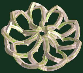 | Keywords: mathematica 3d cg parametricplot3d texture torus code program algorithm tri-torus tritorus プログラム コード アルゴリズム 輪環 りんかん ドーナツ どーなつ 三芒星 さんぼうせい geometric sculpture geometricsculpture shape geometry sculpture mapping テクスチャ マッピング 模様 もよう abstract 抽象 ちゅうしょう アブストラクト design pattern デザイン パターン graphic グラフィック グラフィクス structure 意匠 構造 symmetry 対称性 たいしょうせい シンメトリー 対称 たいしょう black background organic pattern pastel a = 6; (* center hole size *) b = 3; (* tri-torus *) c = 6; (* distance from the center of rotation *) d = 9; (* number of torus *) h = 2; (* height of a torus *) SetOptions[ParametricPlot3D, PlotRange -> Full, Mesh -> None, Boxed -> False, Axes -> False, PlotPoints -> 400, ImageSize -> 3000, Background -> RGBColor[{20, 50, 30}/255], PlotStyle -> Directive[Specularity[White, 40], Texture[Import["D:/tmp/862.jpg"]]], TextureCoordinateFunction -> ({#4 + #5, #5 / Pi} &), Lighting -> "Neutral"]; f[v_] := TriangleWave[{-1, 1}, v/(2 Pi)]; g[v_] := TriangleWave[{-1, 1}, v/(2 Pi) + 1/4]; x = (a - g[t] - f[b s]) Cos[s] + c; y = (a - g[t] - f[b s]) Sin[s] + c; z = (a - f[t] - h f[b s]); rm = Table[{x, y, z}.RotationMatrix[2 i Pi/d, {0, 0, 1}], {i, d}]; ParametricPlot3D[rm, {t, 0, 2 Pi}, {s, 0, Pi}] (*--- The Texture *) a = 6; (* center hole size *) b = 3; (* tri-torus *) c = 6; (* distance from the center of rotation *) d = 9; (* number of torus *) h = 2; (* height of a torus *) SetOptions[ParametricPlot3D, PlotRange -> Full, Mesh -> None, Boxed -> False, Axes -> False, PlotPoints -> 400, ImageSize -> 3000, Background -> RGBColor[{20, 50, 30}/255], PlotStyle -> Directive[Specularity[White, 40], Texture[Import["D:/tmp/862.jpg"]]], TextureCoordinateFunction -> ({#4 + #5, #5 / Pi} &), Lighting -> "Neutral"]; f[v_] := TriangleWave[{-1, 1}, v/(2 Pi)]; g[v_] := TriangleWave[{-1, 1}, v/(2 Pi) + 1/4]; x = (a - g[t] - f[b s]) Cos[s] + c; y = (a - g[t] - f[b s]) Sin[s] + c; z = (a - f[t] - h f[b s]); rm = Table[{x, y, z}.RotationMatrix[2 i Pi/d, {0, 0, 1}], {i, d}]; ParametricPlot3D[rm, {t, 0, 2 Pi}, {s, 0, Pi}] (*--- The Texture *) |
