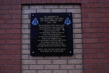 | Keywords: chorley lancashire chorleylancashire chorley 2015 chorley2015 365 remembrance chorley pals chorleypals memorial union street unionstreet booth's supermarket boothssupermarket text brick architecture writing sign street sign The plaque was placed here on the wall of Booth's supermarket by the Royal British Legion. Close to here on the cattle market is the is where, on 26th January 1915 the Chorley Pals were inspected by Brigadier-General G.M. McKenzie before leaving for additional training, deployment in Egypt and eventually to the Somme. The plaque was placed here on the wall of Booth's supermarket by the Royal British Legion. Close to here on the cattle market is the is where, on 26th January 1915 the Chorley Pals were inspected by Brigadier-General G.M. McKenzie before leaving for additional training, deployment in Egypt and eventually to the Somme. |