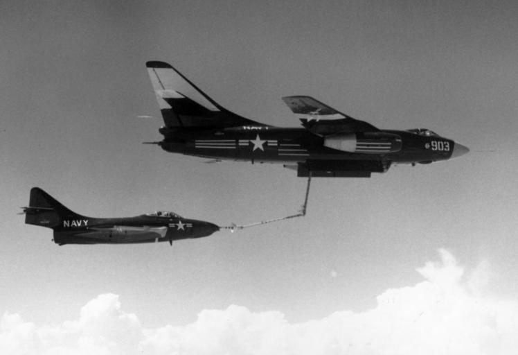 Keywords: A3D-2 experimental refueling of F9F-7.jpg A U S Navy Douglas A3D-2 Skywarrior BuNo 138903 refuels a Grumman F9F-7 Cougar BuNo 141043 during refueling equipment tests in the mid-1950s The internal pipe remained attached to drogue when the F9F disconnected The pilot of the A3D during this flight was test pilot Drury Wood The A3D 138903 later crashed at Edwards Air Force Base California USA during autopilot tests in January 1958 U S Navy National Museum of Naval Aviation photo No http //collections naval aviation museum/emuwebdoncoms/pages/doncoms/Display php irn 16003359 QueryPage 2Femuwebdoncoms 2Fpages 2Fdoncoms 2FAdvQuery php 1996 253 4089 ca 1955 U S Navy PD-USGov-Military-Navy Douglas A-3B Skywarrior Grumman F9F Cougar Aerial refueling |