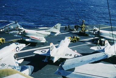 | Keywords: A4D-2 VMA-324 CVA-43 1960.jpg Douglas A4D-2 Skyhawks of U S Marine Corps and U S Navy attack squadrons on the aircraft carrier USS Coral Sea CVA-43 in 1960/61 Carrier Air Group 15 CVG-15 ' aboard the Coral Sea had four Skyhawk squadrons assigned for a deployment to the Western Pacific from 19 September 1960 to 27 May 1961 Two additional Marine Corps squadrons were assigned VMA-121 Green Knights and VMA-324 Vagabonds Both squadrons did not adopt CVG-15´s tail code NL but kept their own tail codes VK VMA-121 and DX VMA-324 This picture shows five A4D-2s Three from VMA-324 in the foreground DX-616 DX-624 BuNo 142873 and DX-626 BuNo 142854 ; NL-502 BuNo 145046 and NL-510 from VA-155 Silver Foxes In the foreground two Douglas A3D-2 Skywarriors of heavy attack squadron VAH-2 Royal Rampants are partly visible in the background is one of helicopter utility squadon HU-1 Det D Pacific Fleet Angels Piasecki HUP-2 Retriever helicopters The A4D-2 145046 was later sold to Singapore converted to an A-4S U S Navy sailor or employee http //www usscoralsea net/images/jlrespot jpg ca 1960-1961 Photographer John Lyons USN PD-USGov-Military-Navy A-4B Skyhawk Aboard USS Coral Sea CV-43 Attack Squadron 155 United States Navy Marine Attack Squadron 324 Helicopter Combat Support Squadron 1 United States Navy |