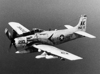 | Keywords: A-1H Skyraider of VA-165 off Vietnam in 1966.jpg A U S Navy Douglas A-1H Skyraider BuNo 135272 of Attack Squadron 165 VA-165 Boomers in flight VA-165 was assigned to Carrier Air Wing 10 CVW-10 aboard the aircraft carrier USS Intrepid CVS-11 for a deployment to Vietnam from 4 April to 21 November 1966 <br>The A-1H 135272 was later transferred to the U S Air Force as s/n 52-135272 It served with the 6th Air Commando Squadron 14th Air Commando Wing and was shot down by ground fire near the Kham Duc Special Forces Camp Quang Tin Province South Vietnam on 12 May 1968 The pilot bailed out and was rescued by a U S Army helicopter http //collections naval aviation museum/emuwebdoncoms/pages/doncoms/AdvQuery php U S Navy National Museum of Naval Aviation photo No http //collections naval aviation museum/emuwebdoncoms/pages/doncoms/Display php irn 16002120 QueryPage 2Femuwebdoncoms 2Fpages 2Fdoncoms 2FAdvQuery php 1996 253 2847 1966 U S Navy PD-USGov-Military-Navy AD-6 A-1H Skyraider Attack Squadron 165 United States Navy Vietnam War in 1966 |