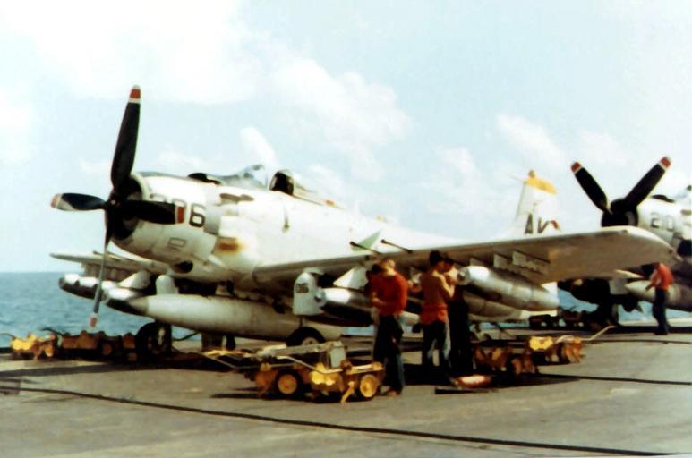 | Keywords: A-1H of VA-165 is armed on USS Intrepid (CVS-11) 1966.jpg A U S Navy Douglas A-1H Skyraider BuNo 137534 of Attack Squadron 165 VA-165 Boomers is armed with napalm canisters aboard the the aircraft carrier USS Intrepid CVS-11 VA-165 was assigned to Carrier Air Wing 10 CVW-10 aboard the Intrepid for a deployment to Vietnam from 4 April to 21 November 1966 <br>On 2 September 1966 the A-1H 137534 was hit by ground fire near Vinh Son 16 km west of Mu Ron Ma Quang Binh Province North Vietnam The pilot was able to fly out to the Gulf of Tonkin where he bailed out and was rescued by a U S Navy helicopter http //collections naval aviation museum/emuwebdoncoms/pages/doncoms/AdvQuery php U S Navy National Museum of Naval Aviation photo No http //collections naval aviation museum/emuwebdoncoms/pages/doncoms/Display php irn 16002122 QueryPage 2Femuwebdoncoms 2Fpages 2Fdoncoms 2FAdvQuery php 1996 253 2849 1966 U S Navy PD-USGov-Military-Navy AD-6 A-1H Skyraider Attack Squadron 165 United States Navy Aboard USS Intrepid CV-11 Napalm Vietnam War in 1966 |