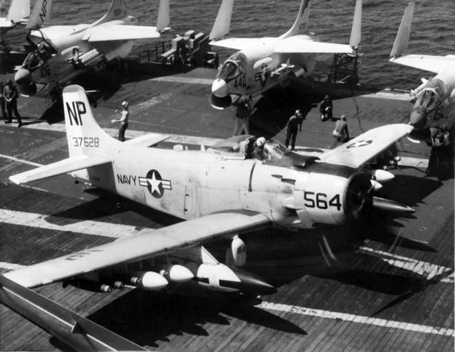 | Keywords: A-1H VA-215 armed for strike CVA-19 1965.jpeg  A U S Navy Douglas A-1H Skyraider BuNo 137628 from Attack Squadron VA-215 Barn Owls ready for launching aboard the aircraft carrier USS Hancock CVA-19 in 1965 IN the background are a Vought F-8C Crusader NP-440 BuNo 147008 from Fighter Squadron VF-24 Red Checkertails and an F-8E from VF-211 Checkmates NP-106 BuNo 150914 The aircraft were assigned to Attack Carrier Air Wing 21 CVW-21 for a deployment to Vietnam from 21 October 1964 to 29 May 1965 <br> The photo was taken during attacks by the carriers of Task Force 77 USS Ranger CVA-61 USS Coral Sea CVA-43 and USS Hancock CVA-19 which conducted air strikes against North Vietnamese bases utilized as training and staging bases for the infiltration of South Vietnam on 7 and 11 Feb 1965 and on 16 and 19 Mar 1965 http //collections naval aviation museum/emuwebdoncoms/pages/doncoms/Query php U S Navy National Museum of Naval Aviation photo No http //collections naval aviation museum/emuwebdoncoms/pages/doncoms/Display php irn 16002256 QueryPage 2Femuwebdoncoms 2Fpages 2Fdoncoms 2FAdvQuery php 1996 253 2981 1965 U S Navy PD-USGov-Military-Navy Aboard USS Hancock CV-19 AD-6 A-1H Skyraider Attack Squadron 215 United States Navy F-8C Crusader Fighter Squadron 24 United States Navy Fighter Squadron 211 United States Navy United States Navy in the Vietnam War |