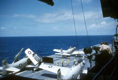 | Keywords: A-1s launching CVA-19 1963.jpg Douglas A-1H Skyraiders of attack squadron VA-215 Barn Owls Carrier Air Group Twenty-One CAG-21 are being launced from the aircraft carrier USS Hancock CVA-19 in June 1963 The A-1H BuNo 139612 on the left is armed with rockets and bombs from the Second World War 5 in 12 7 cm HVAR rockets and 500 lb bombs This aircraft was later passed on to the South Vietnamese Air Force www usshancockcv19 com http //www usshancockcv19 com/gallery5/dthomas htm 1963-06 Dave Thomas USN PD-USGov-Military-Navy AD-6 A-1H Skyraider Aboard USS Hancock CV-19 Attack Squadron 215 United States Navy |