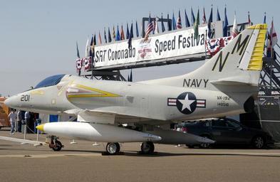 | Keywords: A-4C VA-192 CVW-19 display.jpg A Douglas A-4C Skyhawk on display at the main entrance of the 2006 Coronado Classic Speed Festival The festival held 7/8 October 2006 featured more than 225 of the world's top vintage racing machines competing for honors on a 1 6-mile 3 2 km race course built on the runways and taxiways of Naval Air Station North Island California USA The plane is BuNo 148516 painted in the colours of attack squadron VA-192 Golden Dragons which made four deployments flying the A-4C as part of Attack Carrier Air Group Nineteen CVW-19 tail code NM aboard the aircraft carrier USS Bon Homme Richard CVA-31 between April 1961 and January 1966 Before 1963 the A-4C was designated A4D-2N and before December of the same year the Carrier Air Wing had been designated Carier Air Group CVG Official U S Navy photo 061008-N-7899V-001 http //www news navy mil/management/photodb/photos/061008-N-7899V-001 jpg 2006-10-08 Mass Communication Specialist 2nd Class Susan Van Veen PD-USGov-Military-Navy Douglas A-4C Skyhawk museum aircraft Strike Fighter Squadron 192 United States Navy |