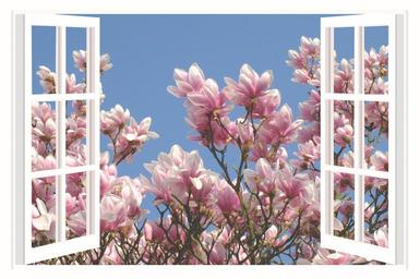Keywords: a beautiful day good mood joy magnolia tree flowers window spring colorful flowers pink a beautiful morning garden white magnolia outlook window frames open colorful farbenpracht horticulture benefit from photo montage