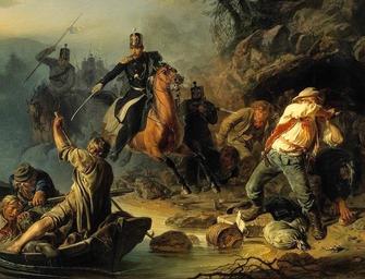 | Keywords: A Brawl with Finnish Contrabandists by Vasili Khudiakov.jpg Artwork Creator Vasily Khudiakov An Encounter with Finnish Smugglers «Стычка с финляндскими конт абандистами» Depicted time the middle of XIX century Depicted event A capture of the group of smugglers from the local residents of the Grand Duchy of Finland many of which are hunted for illegal transfer of goods across the border of the Russian Empire Then coffee salt brandy and tin-plate appear in the list of most commonly encountered smuggling items Изоб ажённое в емя се едина XIX в Изоб ажённое событие Захват г уппы конт абандистов из числа жителей Великого княжества Финляндского многие из кото ых п омышляли нелегальной пе еп авкой това ов че ез г аницу Российской импе ии В списке чаще всего вст ечавшихся в то в емя п едметов конт абанды значатся кофе соль коньяк и «белая английская жесть» 1853 oil canvas cm 95 6 133 6 Museum Tretyakov Gallery This was the first painting acquired by Pavel Tretyakov for the future Tretyakov Gallery CD-ROM Госуда ственная Т етьяковская гале ея Издание 2-е; Допол Издательство AlexSoft 2004 PD-old-100 Other versions Vasily Khudiakov 1853 paintings from Russia Neoclassical paintings in Russia Cavalry of Russia Cavalry in paintings Battle-scene paintings in the Tretyakov Gallery 19th-century history paintings in the Tretyakov Gallery |
