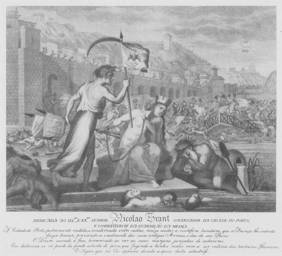 Keywords: A Catástrofe da Ponte das Barcas (1809).png en The Disaster of the Pontoon Bridge Ponte das Barcas at Porto Portugal In the foreground the City of Porto dressed in rags and with shackles on her hands refuses the flag that France tries to make her hold instead of the City's arms and those of the Kingdom Douro River to the right hides its face horrified at the corpse-filled embankment In the background the Ponte das Barcas a floating bridge collapses under the weight of the crowds of civilians trying to escape the invading French army On the sky the star sign a ram - Aries and the date 29 March 1809 give the date of the catastrophe pt A Catástrofe da Ponte das Barcas 1809 no Porto Portugal Em primeiro plano a Cidade do Porto pobremente vestida e com as mãos agrilhoadas recusa aceitar a bandeira que a França lhe intenta fazer tomar privando-a das suas antigas armas e das armas do Reino de Portugal Ao seu lado o Rio Douro esconde a face horrorizado ao ver as suas margens repletas de cadáveres à distância vê-se parte da Ponte das Barcas colapsando sob o peso do povo que foge do exército francês invasor No céu um carneiro o signo e a data 29 de Março de 1809 denotam a época desta catástrofe 1809 https //www pcv pt/lot php ID 59214 ref search lot-title sid e708cf9770f9b80af7992f5cc9323edc Palácio do Correio Velho author other versions Custom license marker 2016 12 03 PD-old-100 Ponte das barcas 1800s lithographs 1809-03-29 1809 in Portugal Views of Porto